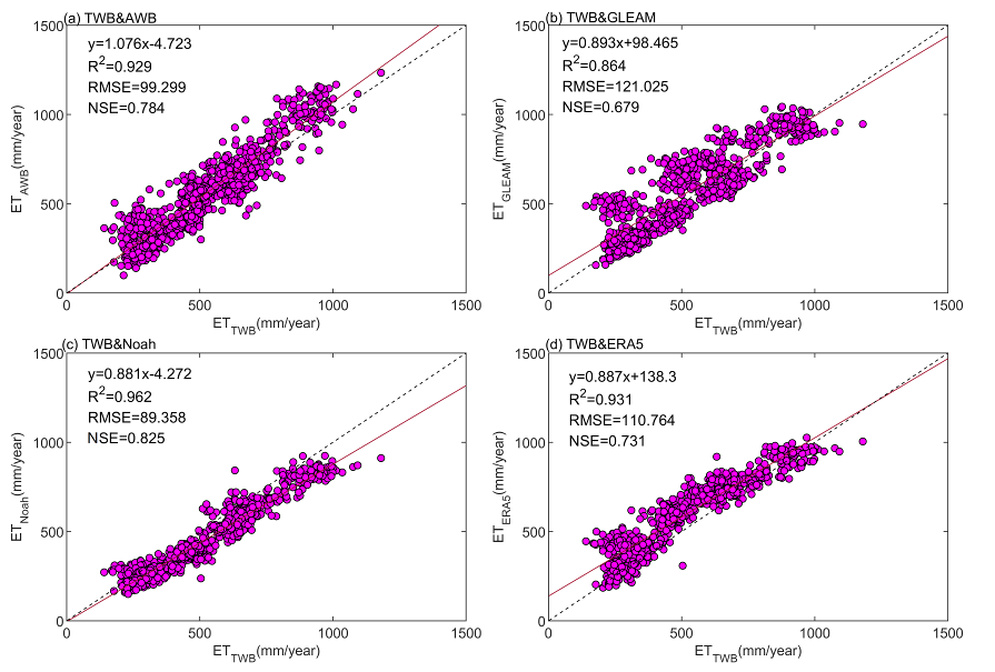 图1 ETAWB、GLEAM、Noah、ERA5相对于ETTWB的回归散点图