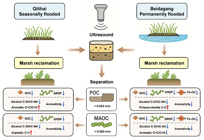研究发现:湿地开垦显著降低了土壤有机碳(-8.7–96.4%)和GRSP含量(-21.2–84.7%),且永久性淹水的北大港湿地响应更为强烈;Fe-OC 的变化受初始淹水条件调控,北大港湿地开垦后 Fe-OC 显著降低,而七里海季节性淹水湿地无明显变化。GRSP 与无定形铁含量的增加有助于有机碳积累,且在北大港湿地中 GRSP 与 Fe-OC 协同促进碳固定。开垦后,土壤中醇类C-OH/C-NH键的相对吸光度降低,多糖C-O键增加,导致有机碳芳香性显著下降,但顽固性无明显变化。此外,POC 和 MAOC 对开垦的响应存在差异,永久性淹水湿地开垦后有机碳库和组分的变化幅度显著大于季节性淹水湿地。该研究揭示了不同淹水条件下滨海湿地开垦对土壤有机碳系统的影响机制,为针对性开展湿地保护与农田生态管理提供了科学依据。