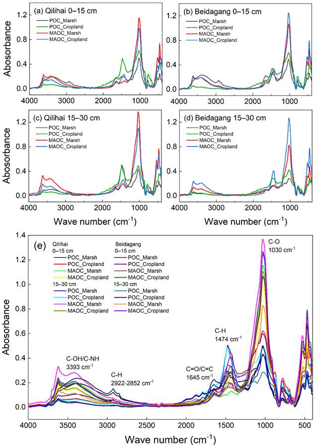 图2 滨海湿地及开垦后农田土壤有机碳粒级组分的傅里叶红外光谱