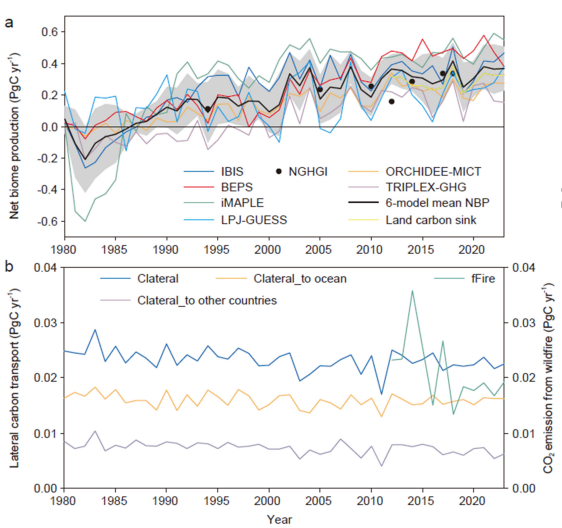 图1. BEPS、IBIS、iMAPLE、LPJ-GUESS、ORCHIDEE-MICT和TRIPLEX-GHG模型模拟的中国陆地净碳通量(NBP),以及6个模型平均的净碳通量(黑线),灰色阴影区代表±1标准差(a)。2012-2023年的陆地碳汇(a, Land carbon sink)是通过从NBP中减去横向有机碳运输(Clateral,b)和野火碳排放(fFire,b)计算得出的。横向有机碳迁移包括向海洋和其他国家的碳转移(b)。(a)中的黑色圆点表示国家温室气体清单(NGHGI)给出的陆地碳汇估计值。